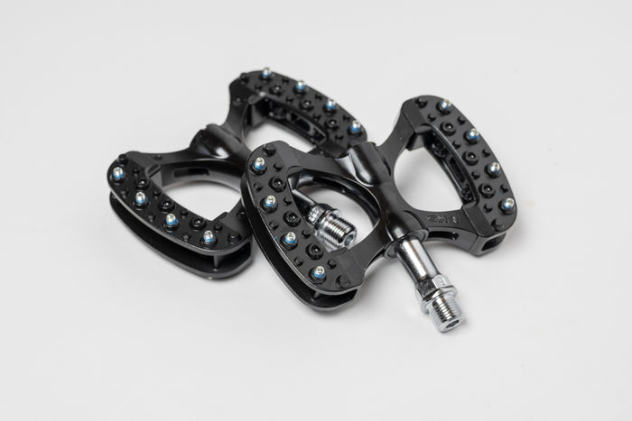 All are double-sided platform pedals. Some can accept toe-clips, but they work better without. These are the ones we ride most of the time. Mark rides clipless a lot, we have that window into reality.
