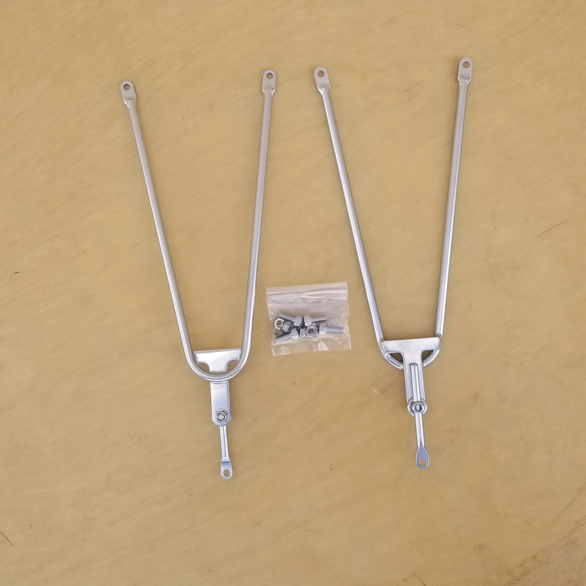 The connection to the fork dropouts use Nitto struts and hardware so it's easy to adjust the height of the platform for everything from 26' to fat 29'er bikes. The diving plate is slotted so you can butt it up as close as possible to the headtube for good front-end handling. And it's collapsible, for easy shipping.