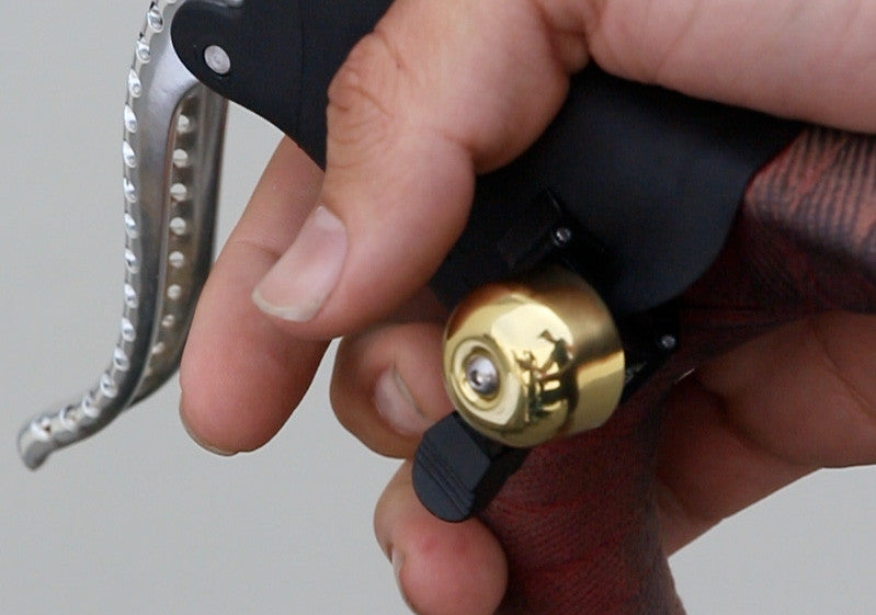 If a normal bell is too pedestrian for your road bike but you're still cool enough to want a bell, get this one. It snugs stealthily under the brake lever hood or onto a convenient cable or within reason anywhere you want to put it, and rings with a finger flick. Not as loud as the bigger brass bells, but it emits a crisp medium ping that penetrates folks without earbuds will hear. Brass!
