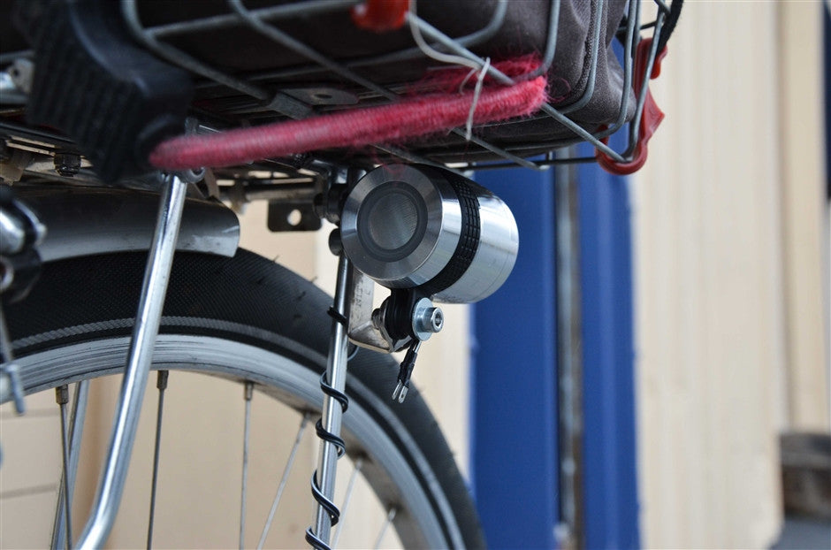 This is B+M's new maximally bright, minimally styled, dyno headlight. At 100 lux it's as bright as you will probably ever, ever need, and it throws a wide, tall, multi-section cone of light without too much elaborate beam-shaping. The aluminum housing gives the lamp a clean and classy, yet high-tech appearance, and acts as a heat sink to keep the powerful LED cool. It also seems to do a good job at weather-proofing (yes, ours has been rained on more than a little this year.).