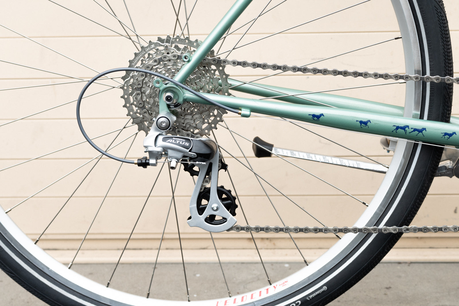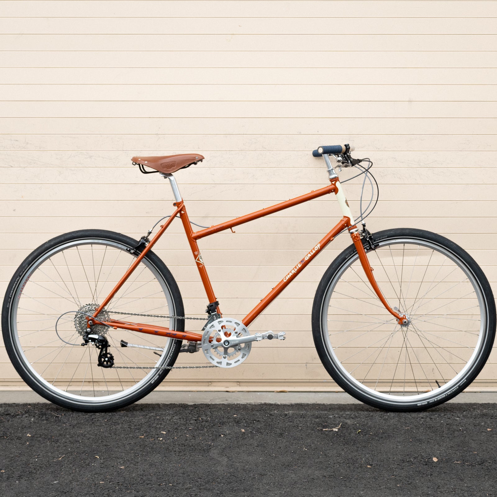 OTHER PARTS: Not many limitations—shifters and derailers anything you like, and so on. It takes a 1-inch threaded headset like most of our bikes, The BB shell is our normal 68mm threaded. Seat post is 26.8mm. Front derailer clamp size is 28.6mm, easy to get. A lot of our “normal” dimensions are also historically normal, but are less common on modern bikes that have wild (by our standard) dimensions. But we’re a good source for any part you could ever dream about putting on the Charlie H. Gallop. It’s a solid, smart, versatile mechanical bicycle with no built-in planned obsolescence.
