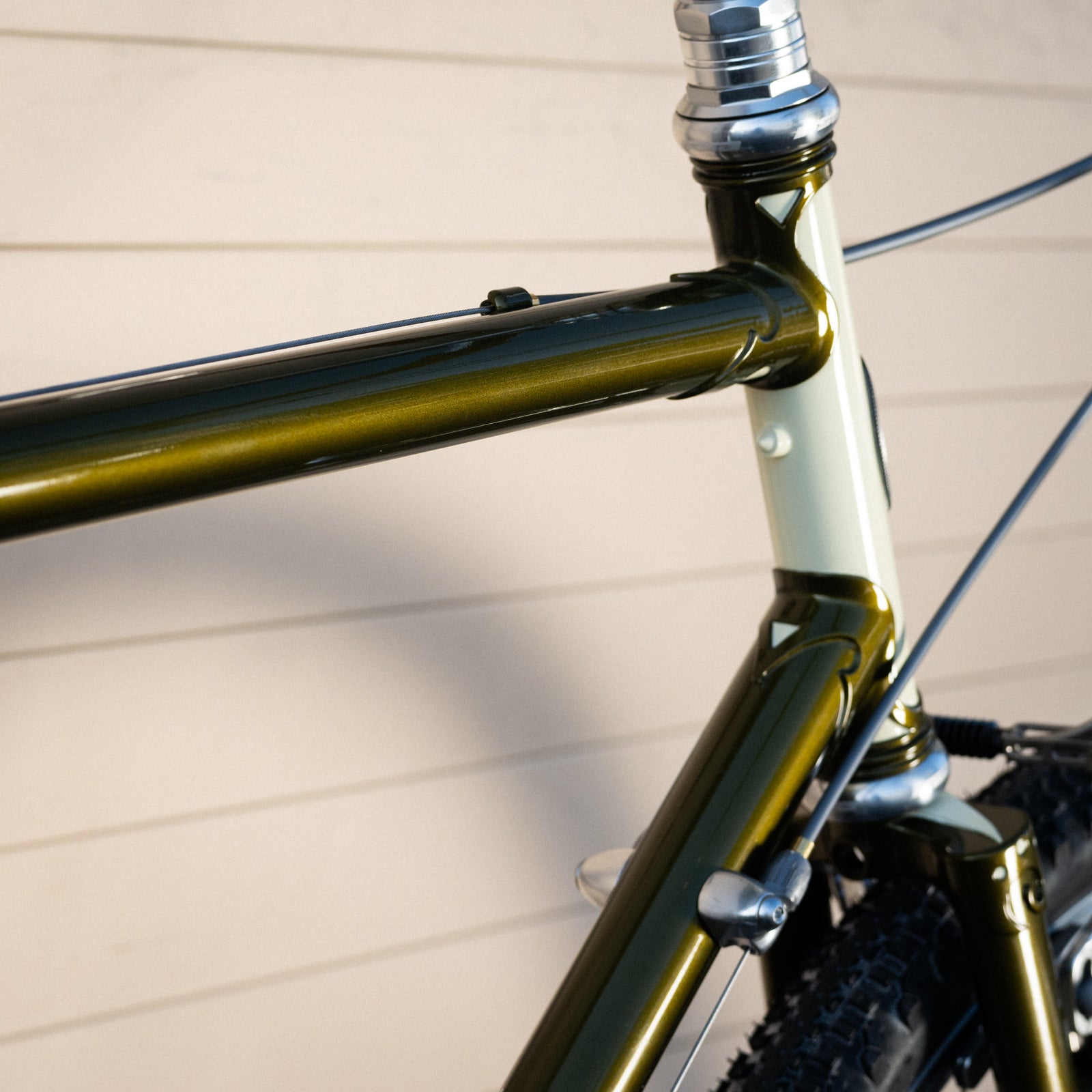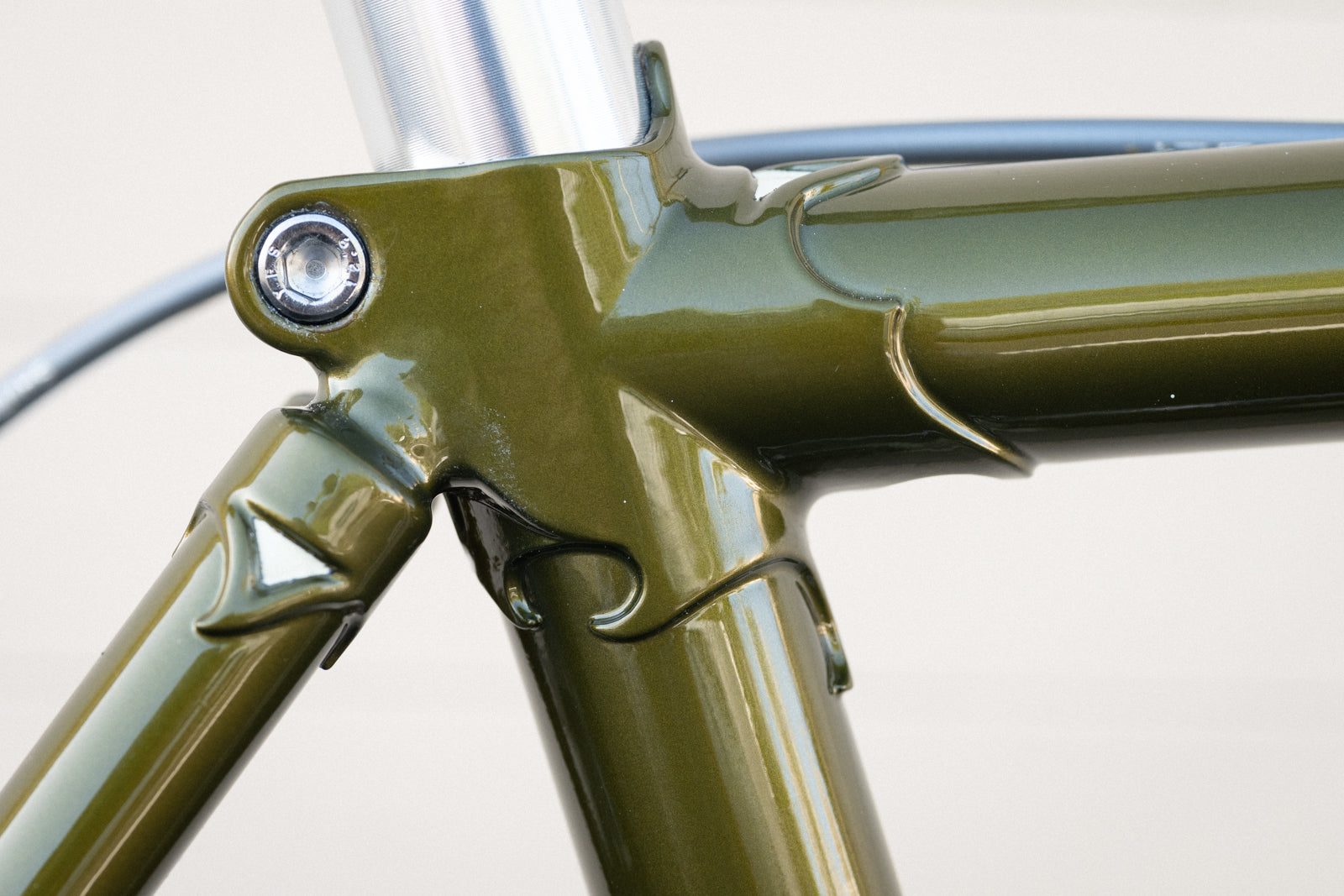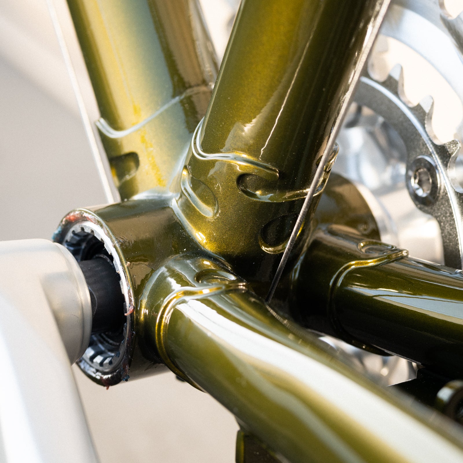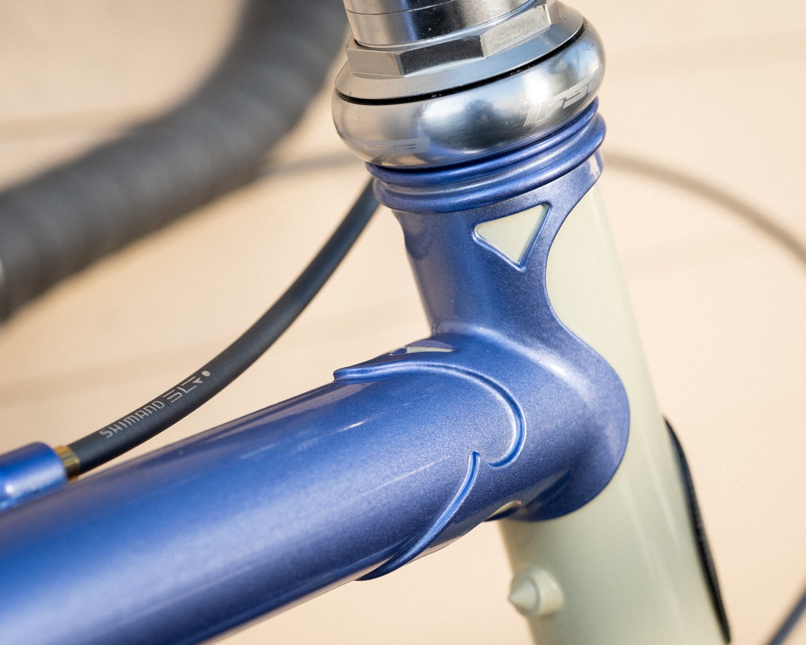 We pay attention to even the most superficial details: The stress-relief hole on the back of the seat lug is painted cream. The wings on the fork crown, too. The seat tube and down tube decals are in exactly the right spot, something that always used to happen before the 21st century came around and people with no taste took over. The letters are filled with cream, edged in black, and "halo'd" in gold, for an easy-on-the-eye transition to the paint color. The fork's curved and tapered blades have wild and crazy, beautiful cream-edged dropouts. The bottom bracket shell is designed to minimize stress, with curves where other shells have points; and with windows to aid the brazer. Age, scrapes, grime, and other signs of use just make it look better.