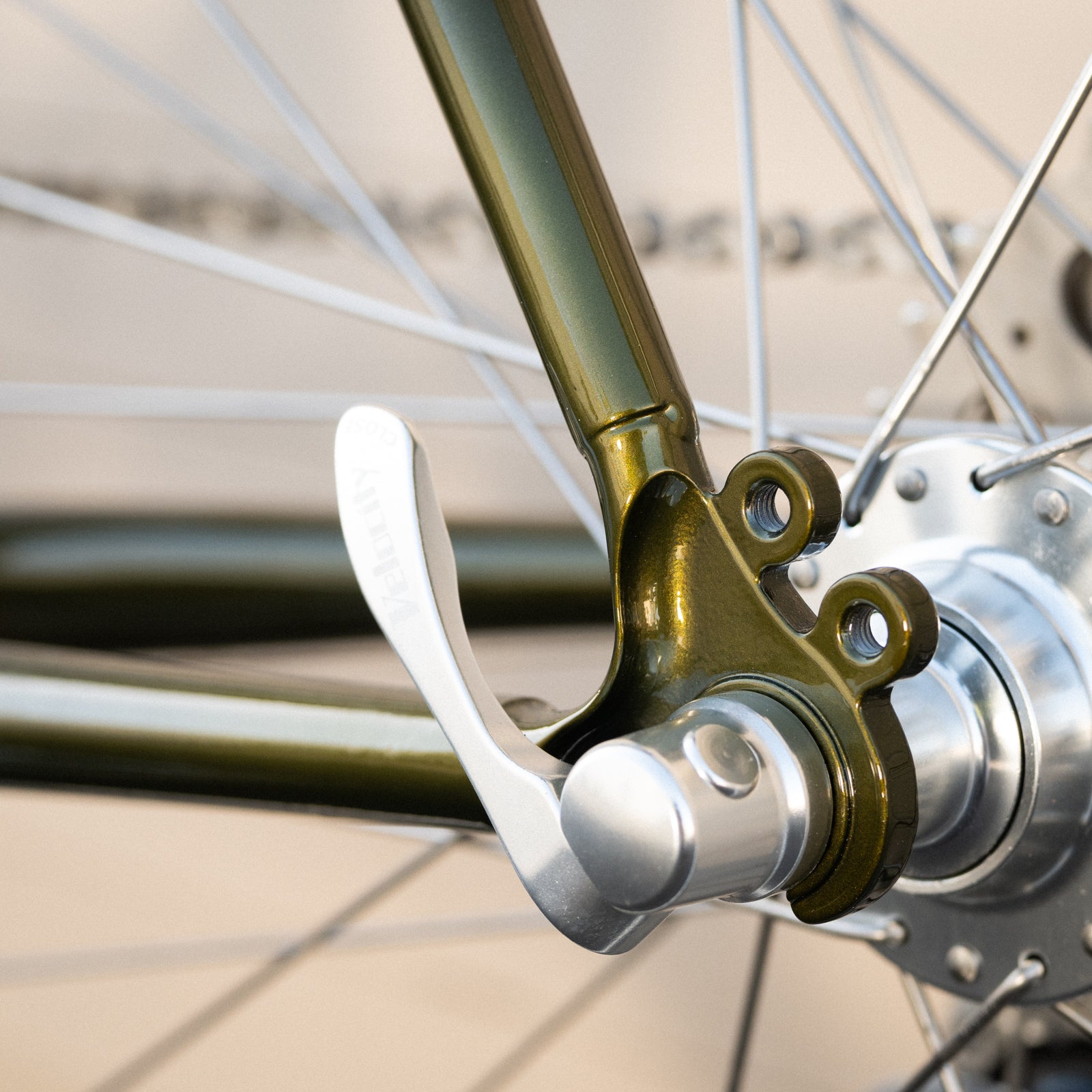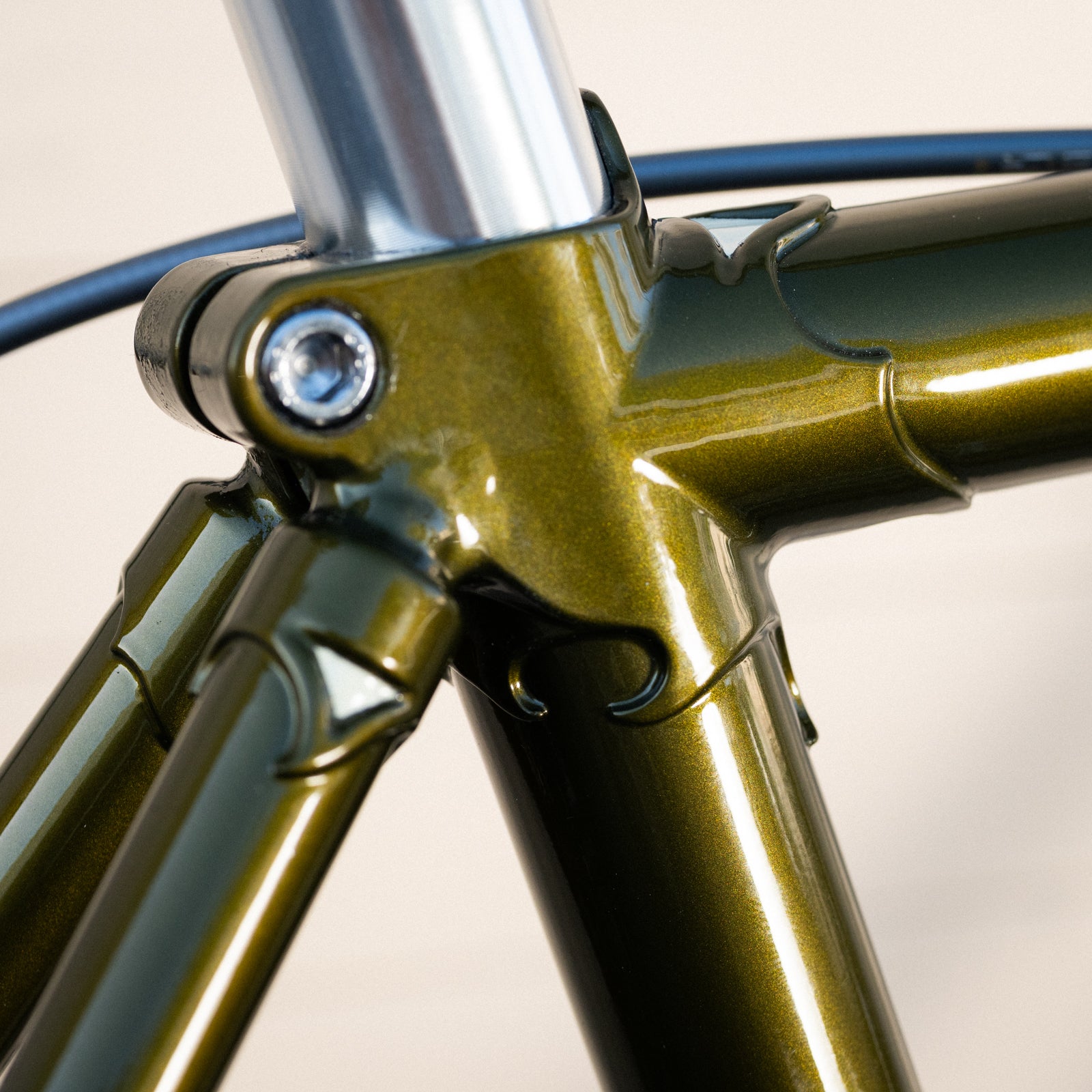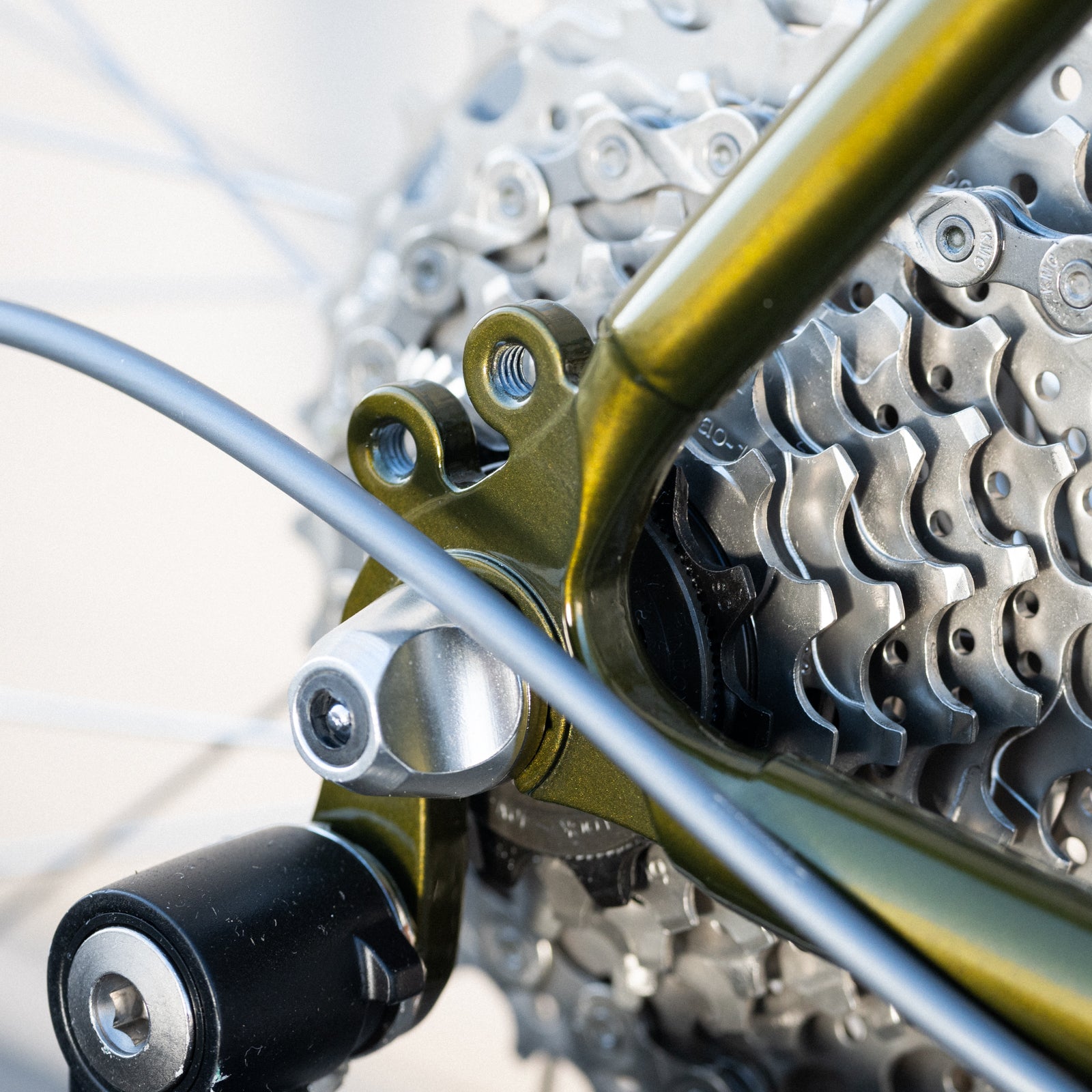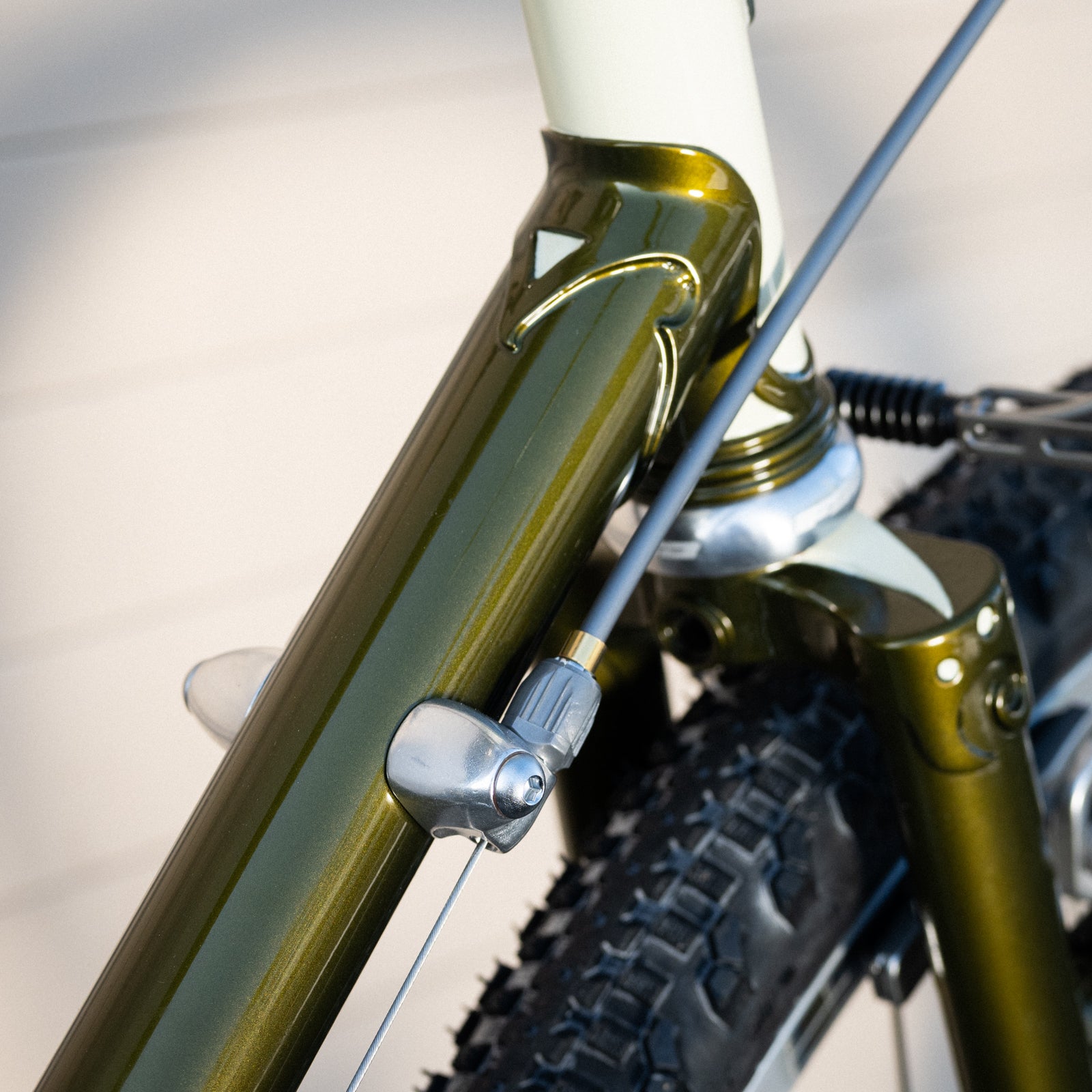 We pay attention to even the most superficial details: The stress-relief hole on the back of the seat lug is painted cream. The wings on the fork crown, too. The seat tube and down tube decals are in exactly the right spot, something that always used to happen before the 21st century came around and people with no taste took over. The letters are filled with cream, edged in black, and "halo'd" in gold, for an easy-on-the-eye transition to the paint color. The fork's curved and tapered blades have wild and crazy, beautiful cream-edged dropouts. The bottom bracket shell is designed to minimize stress, with curves where other shells have points; and with windows to aid the brazer. Age, scrapes, grime, and other signs of use just make it look better.