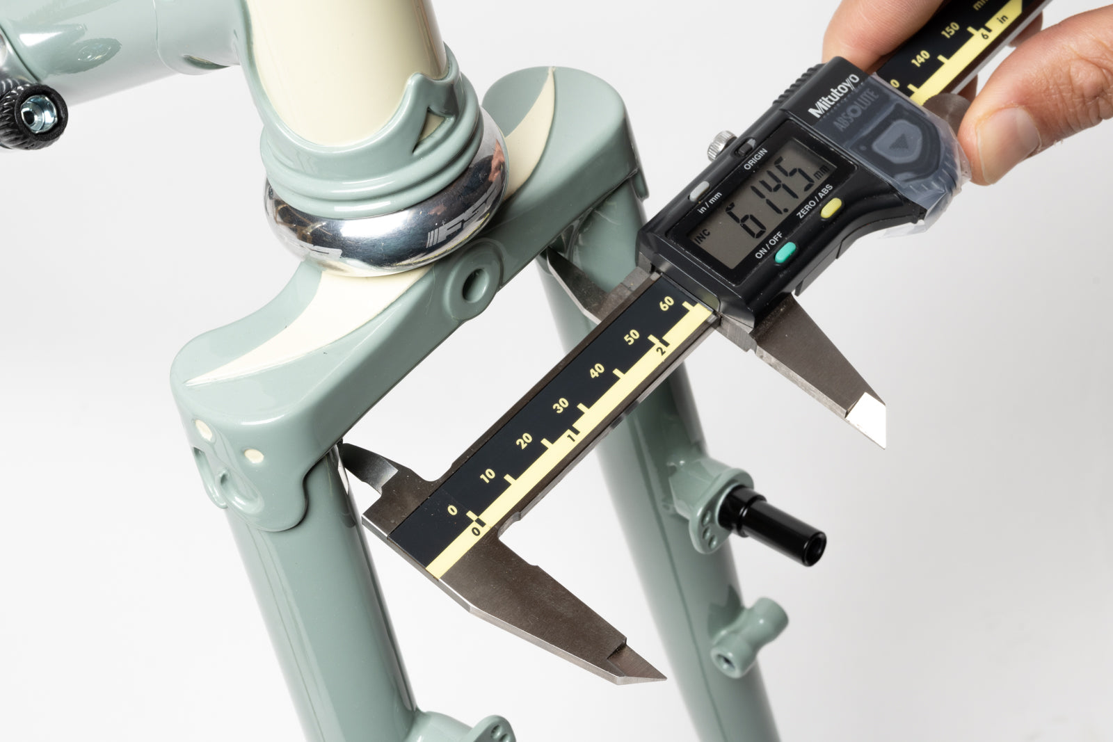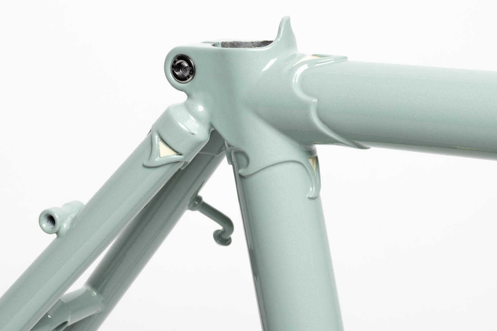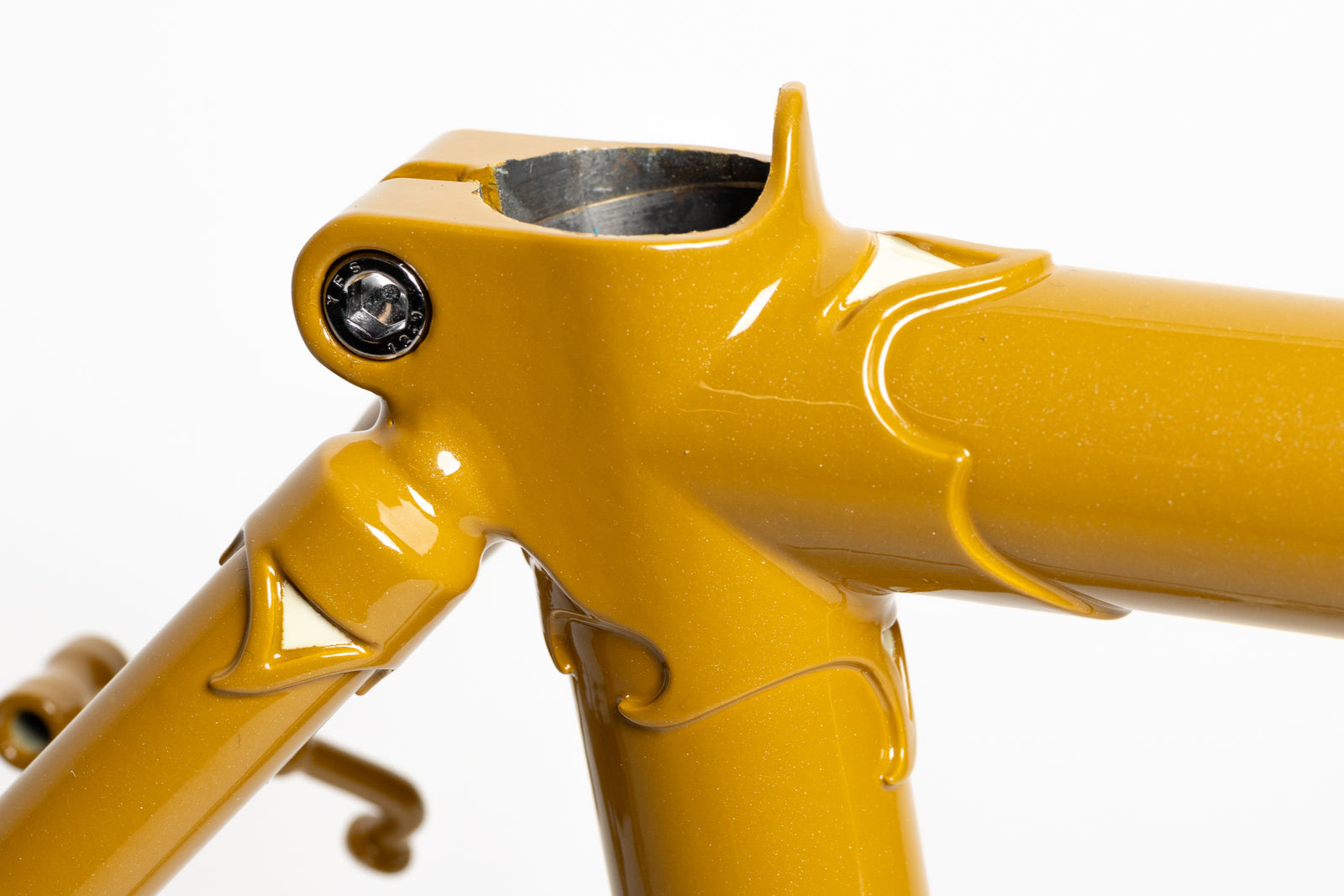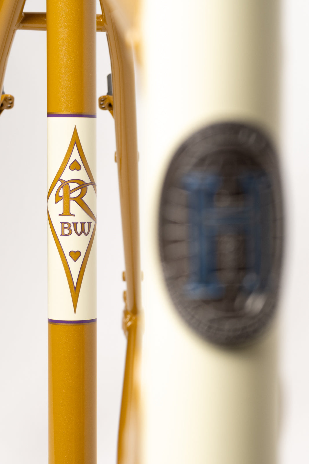 We pay attention to even the most superficial details: The stress-relief hole on the back of the seat lug is painted cream. The wings on the fork crown, too. The seat tube and down tube decals are in exactly the right spot, something that always used to happen before the 21st century came around and people with no taste took over. The letters are filled with cream, edged in black, and "halo'd" in gold, for an easy-on-the-eye transition to the paint color. The fork's curved and tapered blades have wild and crazy, beautiful cream-edged dropouts. The bottom bracket shell is designed to minimize stress, with curves where other shells have points; and with windows to aid the brazer. Age, scrapes, grime, and other signs of use just make it look better.
