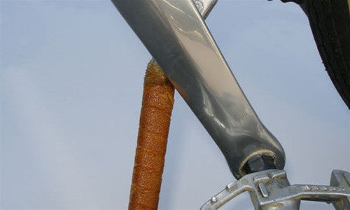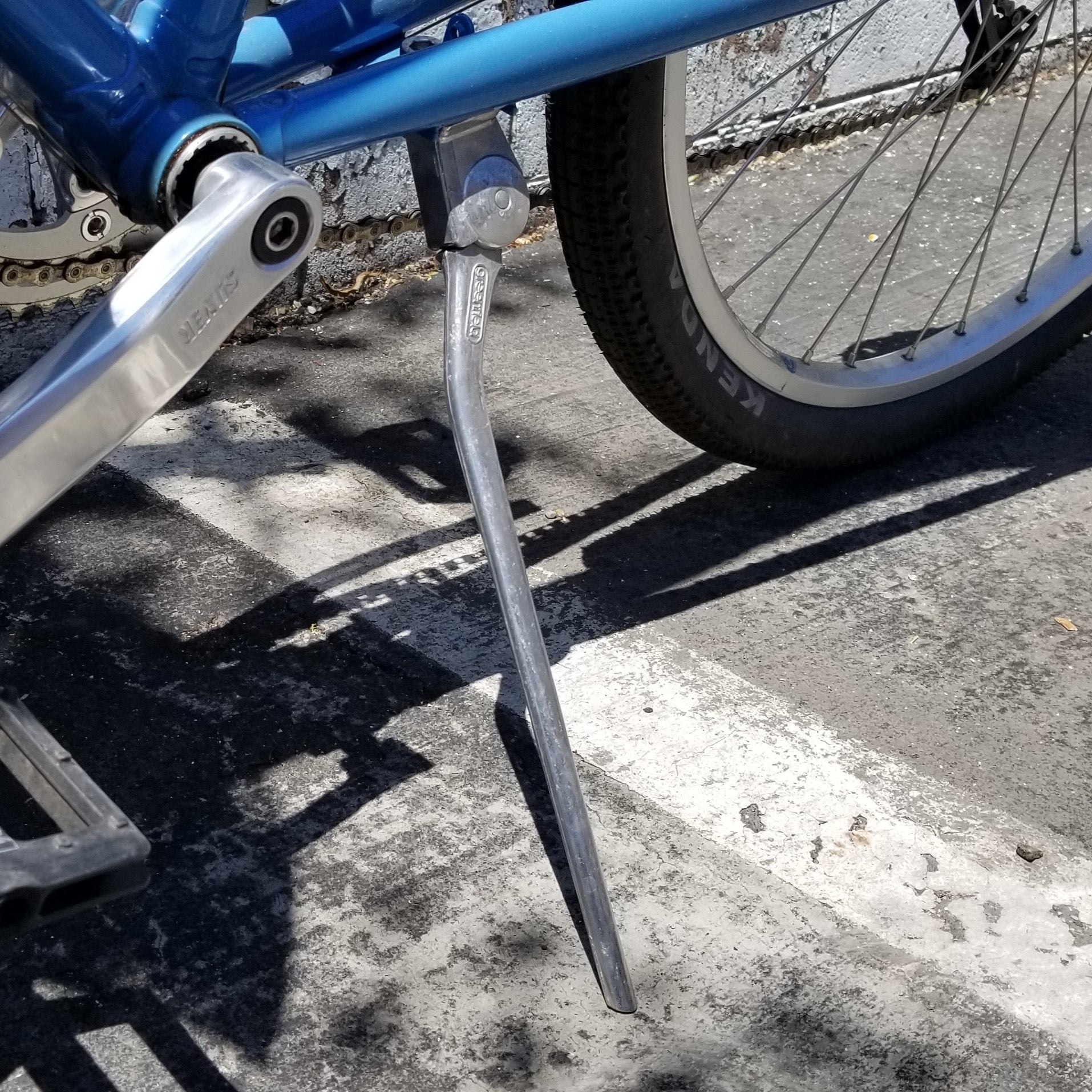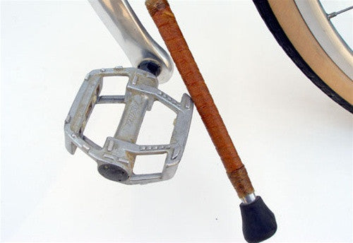 TIP: Tape or otherwise pad the part that'll contact the pedal and crank arm. You've got to go pretty high up on the 'stand. It's not a hassle, just another place to use bar tape, twine, and shellac. (Or do it some other easier way like knitting a cozy). It's not being weird, trying too hard to be classy, or anything like that. If you've got a decent crank, simply protect it from getting scratched and dinged by the kickstand...and that's how you do it. You cover it.