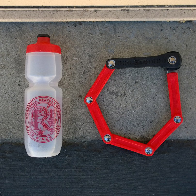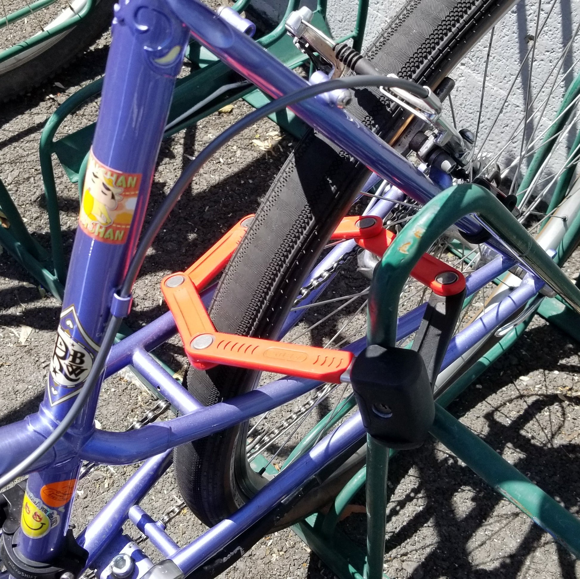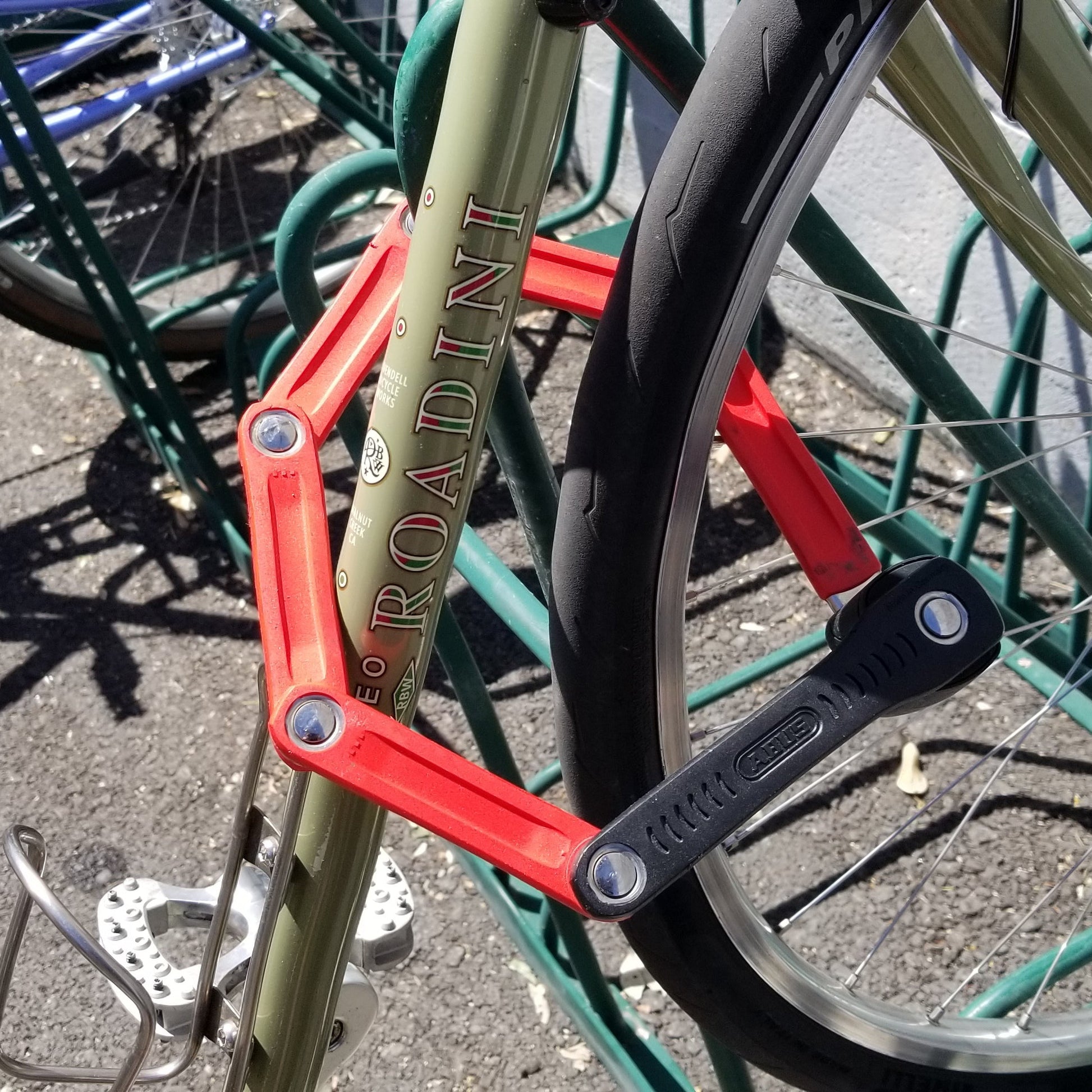 It’s a folding key-lock lock that works like grampa’s articulated ruler, but the arms are made of steel alloys, so it’s not just light, but compact, too. It won’t fit around a fat tree, but a metal pole, no problem.