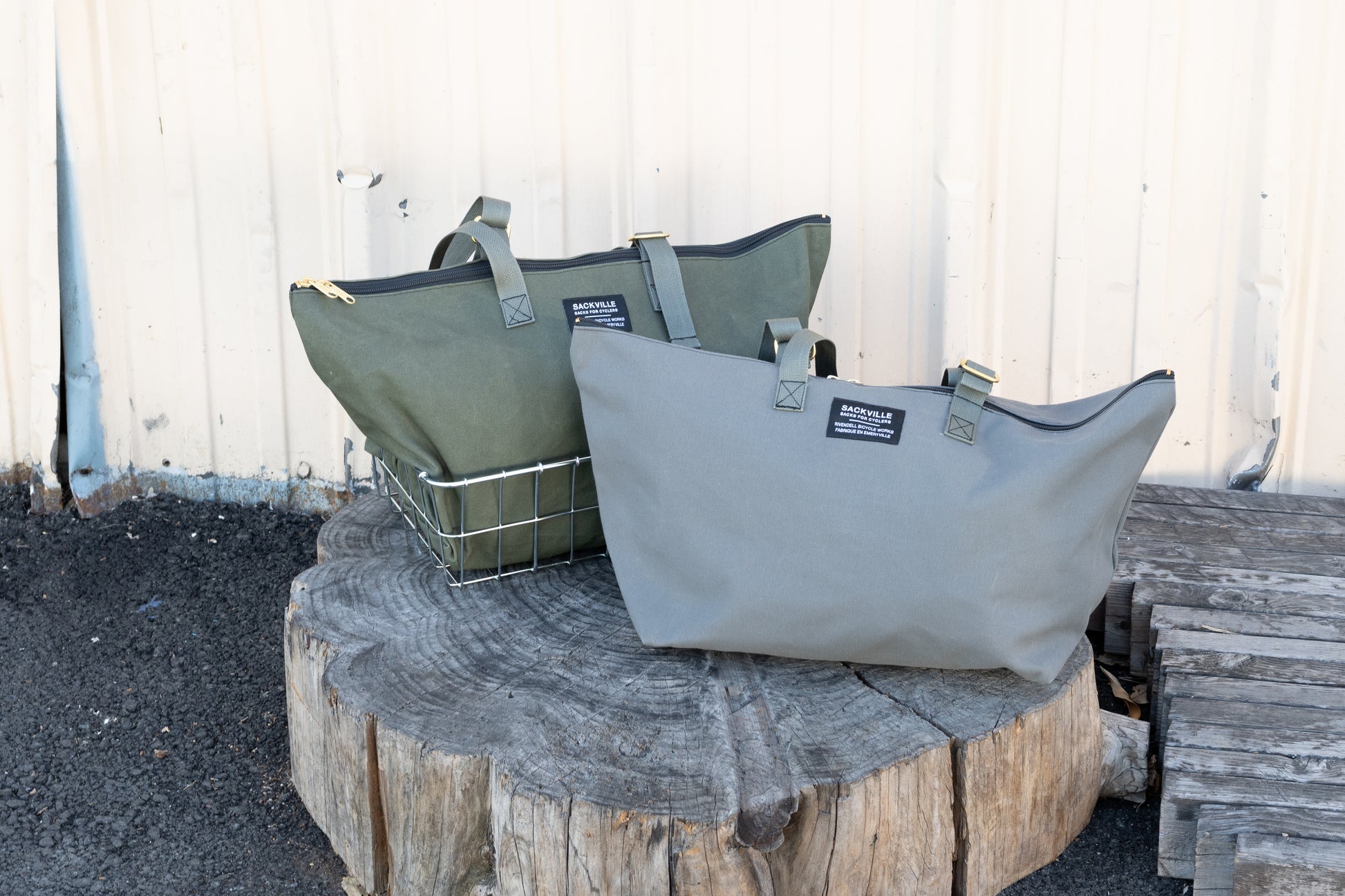 ShopSacks are wider than the are tall, so they're easy to pack and unpack. The fabric is the best dry-waxed cotton we can find in the world. The handles are the best U.S.-made military spec nylon that will never crap out on you and resists twisting; a #5 Coil zipper closes it, and there's a zippered pocket inside for whatever makes sense.